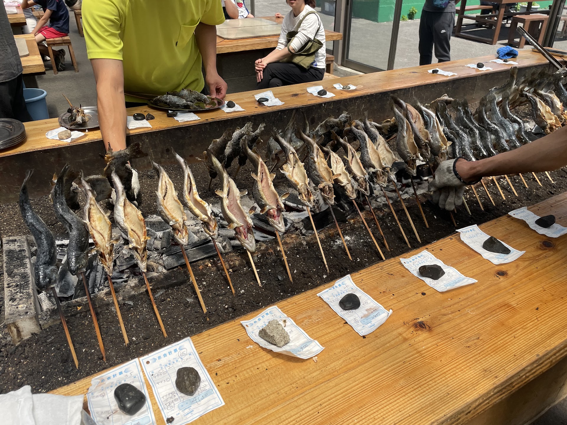 掴み取りは以前は体験すると1尾塩焼きが付いてきたのですが、今回は体験費が安くなって塩焼きは別売りになっていました。魚釣りは釣った分買い取りだったかと思います。 もし塩焼きを食べたいのであればこちらも混雑していると焼き上がりまでにかなり時間がかかるので先に注文しているといいでしょう。