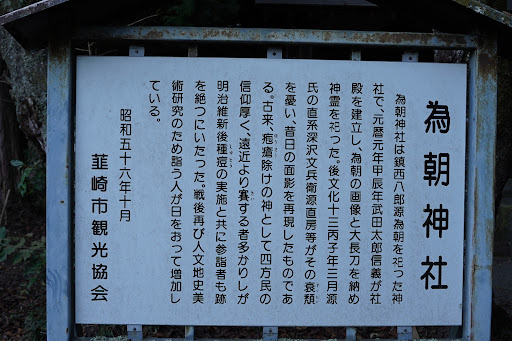Read more為朝神社 為朝神社は鎮西八郎源為朝を祀った神社で、元暦元年甲辰年武田太郎信義が社殿を建立し、為朝の画像と大長刀を納め神霊を祀った。後文化十三丙子年三月源氏の直系深沢文兵衛源直房等がその衰頽を憂い、昔日の面影を再現したものである。古来、疱瘡除けの神として四方民の信仰厚く、遠近より賽する者多かりしが明治維新後種痘の実施と共に参詣者も跡を絶つにいたった。戦後再び人文地史美術研究のため詣う人が日をおって増加している。 昭和五十...