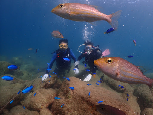 研修旅行にてオーナーが予約して下さいました。七名で参加しましたが、経験者は私ともう一名でしたが、私も20年ぶりでしたから、ほぼ初心者でした。 最初にしっかりと注意事項や用具の使い方などを丁寧に教えていただきました。 私達二人にインストラクター一名がついて、コンクリートのスロープ沿いに太いロープが張ってあり、インストラクターの指示にしたがいながらロープ沿いにゆっくりと進んで行きました。途中で何度も安全確認をしていただきながら、ゆっくりと進んで行きました。 小さな魚がいたので、ボードに魚の名前を書いて下さって、とても安心しながら楽しんでいらと、大きな真鯛がいて驚きました。シマはぜやウツボの他にもたくさん魚がいたので、あっというまのとても楽しいスキューバダイビングを経験することが出来ました。 また、西伊豆に来る機会が有れば、優しい皆さんに会いにきて、ダイビン...