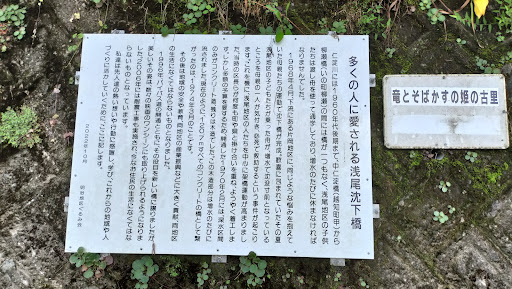 現在は、仁淀川の下流から3番目の沈下橋になります。昭和45年(1970年)2月に完成し、浅尾地区と鎌井田地区を結んでいます。 名越屋沈下橋・片岡沈下橋・浅尾沈下橋の順番で、仁淀川の下流側から見ていく場合には、国道194号線を利用しますが、194号線から県道18号線で浅尾沈下橋に行く場合、とても道幅の狭い所を数カ所通ることになりますので気を付けて下さい。 今日は、浅尾沈下橋だけの予定だったので、国道33号線から県道18号線経由で行きました。浅尾トンネルを抜け、浅尾橋?を渡った所に大きな看板があります。 また、浅尾沈下橋のすぐ近くに8〜10台は停められる駐車スペースがあるのは助かります。(今日は途中雨が強くなり、いったん車で雨宿りしました)