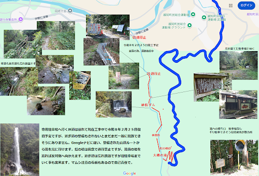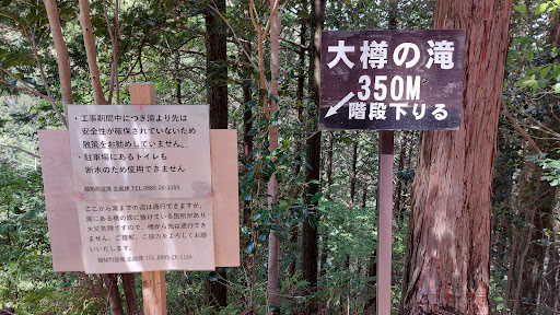 大樽の滝への一般的なアクセスルートは、案内看板に従い国道33号線の越知10区交差点(越知橋のたもと)を酒折川上流方面に曲がり、県道18号伊野仁淀線を800m程進むと、町道大樽線の入口が案内看板と共に左側にあります。この道を500m程入った所にある駐車場から滝壺までの約500mの間には遊歩道が整備されていて、子供と一緒でも歩いて行くことができます。 但し、2025年5月1日現在、遊歩道が落石や倒木などの発生により安全性が確保されていないことや、町道改良工事中により通行止めとなっているため、このルートからは滝には行けません。GoogleMapに「臨時休業」と示されているのは、こうした理由からです。 それでも滝を訪れたいという場合は、Google...