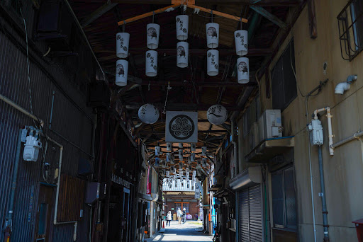 昔の岡崎市の花街。 昭和の雰囲気が漂う横丁。 小さな木造店舗がひしめいて、なんとも温かい裏路地になっています。