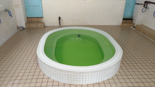 洗い場は温冷2つの蛇口にY字型のホースが繋がっており、両方を混ぜて温度調節します。 湯船は特に循環式ではないですが、入浴剤が入っているのか緑色がかっていました。