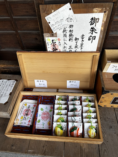 無人的神社,但可感受到有人員細心維護,箱子裡有細緻的檸檬御朱印,檸檬及橘子御守好可愛,領取時要記得投錢,謝謝製作這些的人員,好用心。
