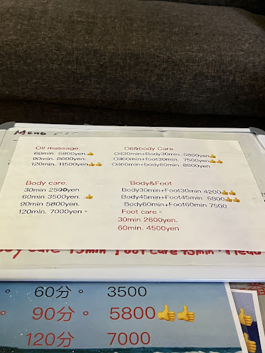The good: nice people. English, Chinese and Japanese is spoken by different therapists. good, strong pressure with a focus on knots and sore points. They seem skilled and good at what they do. Clean establishment. Towels smelt and felt clean A massage table. I’ve seen floor mats or plain tables at other establishments around the area. Drinks were offered at the end along with some candy. Price is good but reflects the service provided. They do have a “tourist” price (different prices on the translated menu). I don’t blame them for that. Seems like some restaurants around Osaka charge an extra 500 yen for tourists. They were willing to give us the regular price for our service.