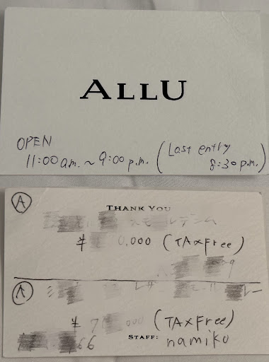 Additionally, we were interested in another product available at a nearby ALLU store, just 5 minutes away. Namiko kindly directed us to the location and gave us another card with the product details. When we arrived at the other store and presented the card, the staff promptly retrieved the product for us to check. The entire process was seamless, and it was clear that ALLU staff across different locations communicated effectively.
