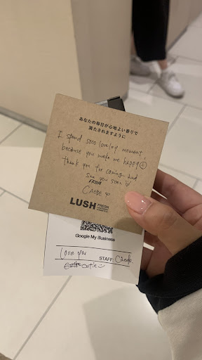 Read moreMy son wanted the new Minecraft goods and was able to get two items (intergalactic bathbomb and Milk bucket soap. He was really happy about it and is now playing the Lush add on in Minecraft. The staff were super friendly and helpful (speaking both Japanese and English). They helped me try a few products and I decided to treat myself and daughter to a new face mask, massage bar and a couple of fun bathbombs. Really fun shopping experience. Thank you to Caede for your help. Special Gift lovely surprise to receive a...