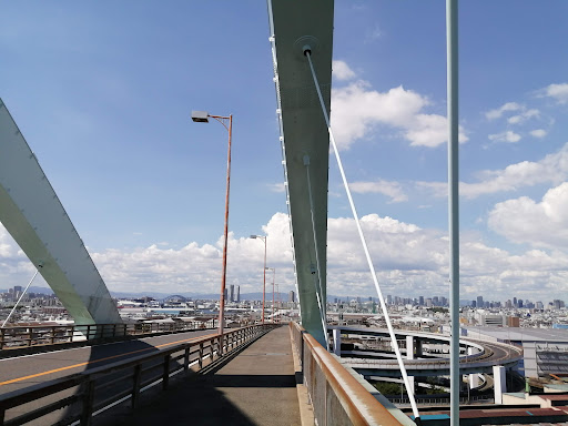 2023.5.下旬 大運橋通バス停·乗換⇏中船町バス停↝新木津川大橋(高さ50m,全長2.4km)↝南港通↝住之江区第197号線↝千本松大橋(航路高33m,全長1230m)↝大運橋通バス停の行程でウォーキングしました。 大運橋通バス停でバスを乗り継ぎ、中船町バス停で降りるといきなり目の前に廃工場?らしきビックリな光景が広がる! さらに行くと新木津川大橋の片メガネ部分の大きな三段ループ橋が現れ迫力満点です! ループ橋内部は船町緑地になっていて木々が綺麗に手入れされていますが!中に入れません?ループ橋からの鑑賞用でしょうか? 木津川飛行場跡の看板があり、時代の変化が感じられます。 ループ橋の歩道は十分に広くて安心して登れます。少しずつ変わる景色に感動します。橋の中央...