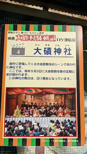 Read more大磧(たいしゃく)神社は、秋葉街道から東にそれた小高い丘の上にあった。 急な坂を上って行くと、いきなり木製の大きな鳥居が現れる。鳥居の奥には、2本の御柱が鎮座していた。諏訪大社と関連がありそうだ。 ここは、春の大鹿歌舞伎が演じられることで有名な所である。毎年5月3日に定期開催されるという。300余年も前から各集落の舞台で演じられてきたもので、江戸から大正期には禁令とされ弾圧された時期もあったようだが、奉納歌舞伎という名目でかいくぐって受け継いで来たのだそうだ。大鹿村の人々...