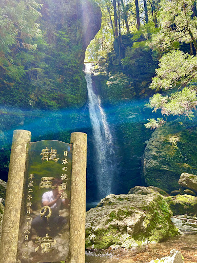 平成2年に“日本の滝百選”に選ばれた滝で、看板には「夜に娘が現れ、実は龍だった」という伝説が記されている。現地に立つとその物語が妙にしっくりくる不思議な空気感。