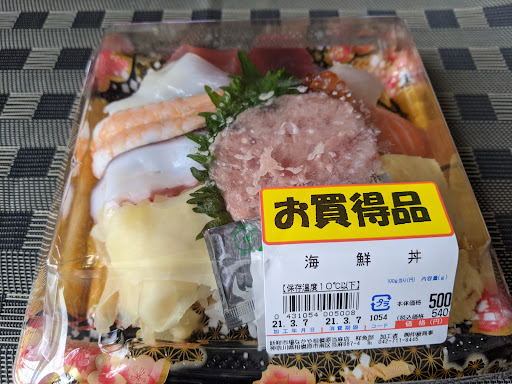 久しぶりに夜の8時頃寄りました。弁当類は完売。お寿司コーナーは値引きして売ってました。598円のお寿司が150円引き450円でしたが購入しました。穴子以外は全部美味しかったです。...
