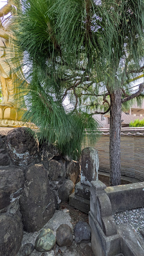 ①1基目は山門入口入り、右奥、黄金色の大きな仏像の脇、松の木の下にありました。 山状角柱型の庚申塔です。 表面が全て剥離しており、目視で確認できる物はありませんでしたが、資料によると正面に「庚申塔」、左側面に「天保九戌歳十一月吉祥日」(1838)と刻まれてたそうです。