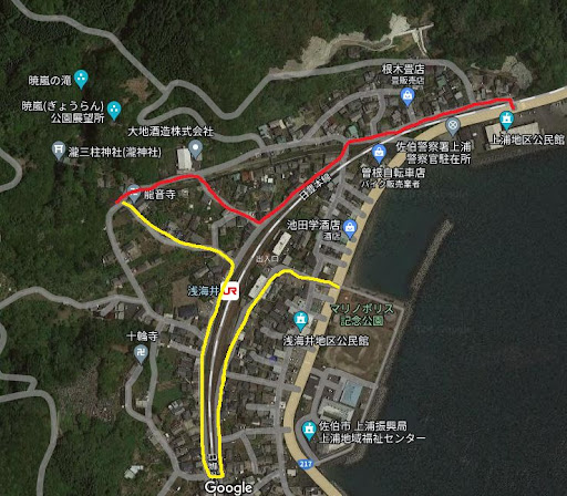 狭い道しかないので車の場合は北側から赤線のルートで入るのが良いと思います。 小さい軽自動車なら直線的に向かったり南...
