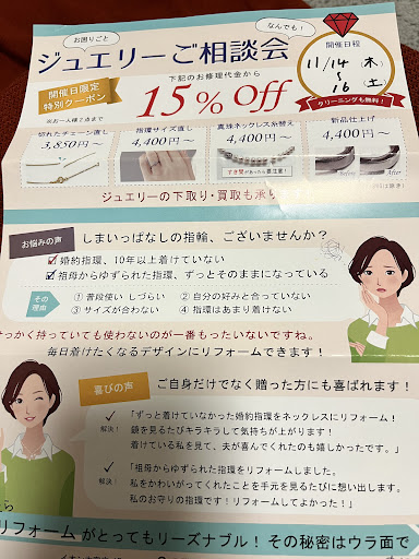 Read moreプレゼントでもらった大切なネックレスの丸カンの修理をお願いしたくて、色々と探していたところこちらのクチコミをみてお邪魔しました。 こちらのお店で購入したものでなくても とても丁寧な対応をしていただき安心しておまかせすることが出来ました。 ¥3,890 LINEクーポンで¥500off...