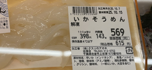 トップマート閉店で不便だったのでアオキがオープンしてくれて助かってはいます。 明らかに設定ミスであろう賞味期限記載をよく見ます。 肉魚の賞味期限日数が大手スーパーより極端に長く設定されています。 加熱用魚類は大手スーパーなら通常翌日賞味期限設定ですがアオキは多くが4日期限。 賞味期限当日の魚類は匂いが気になり怖くて買えません。 実際購入しましたが食べれはしましたが匂い気になりました。 お肉も通常3日だと思いますがアオキは大体4日設定。 お肉ですが賞味期限当日の牛肉の多くが色変,豚肉は匂いがきつい時があります。 冷蔵管理の問題なのかわかりませんがもう少し良い状態で販売して欲しいです。 普通当日か翌日までの刺身用のイカの刺身が賞味期限が9日間もあったり(写真参照,解凍後のなのに冷凍状態の賞味期限を表記?) ないと困るお店ですが改善していただきたいのであえ...