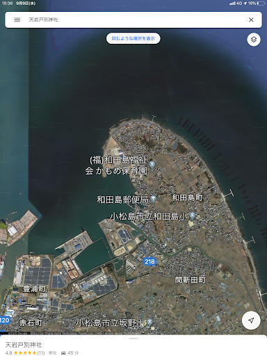 ニニギ神は傘さ岬に漂着しましたところは現在の和田岬です、お遍路さんがかむります、あの傘です、猿田彦大神は高天原でニニギ神と会いまして、立岩神社側とは違うコースをとりまして、おそらくこの地点で休憩をしたのでしよう、後々ここに猿田彦大神の神社ができたのですが本来はニニギ神をお祭りしていましたのを、朝廷の命令で消されています。