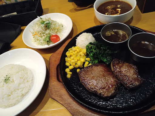 ※当方が食べたものに対する評価です。 ランチメニューは平日以外でも適用だそうで、日曜日に訪問しました。 1000円以内のランチメニューは「チャックステーキランチ(120g)」なのでそれをオーダーします。 ちなみに、食べログの公式写真でもわかりますがメニューにある「霜降りステーキ」は人工霜降り加工がされた所謂「牛脂注入牛」のようです。カウンター席だったため下処理の様子が見られましたが、間違いなく牛脂注入牛でした。当方がオーダーしたチャックステーキ(チャックロールかな?)より価格が高いのはなぜでしょう??別に加工肉が悪いとは思いませんが、メニューに但し書きがあったほうが良いかもしれません。まぁ、それは注文していないので当方には関係ないことです。 まずサラダが供されます。キャベツメインでレタス、ニンジンなどが適度に絡んだオーソドックスなタイプ。ドレッシングはフレンチドレッシングとゴマドレッシングを混ぜたような感じ。これはおいしい。サラダの量も充分です。 メインのお肉は鉄皿で提供。ライスとビーフシチューもここで登場。 チャックステーキは巧みなカットで筋が気にならないような配慮がされているようです。ソースは2種類でガーリックと大根おろし。どちらも醤油系ですが、ガーリックソースのほうが醤油の角が立っている印象。おろしソースのほうがまろやかです。鉄皿の熱で最後のほうでは煮詰まりどちらもかなり塩辛くなります。 肝心の肉ですが、丁寧に筋きりもしてあるようで硬さは感じません。肉の旨みも充分です。120gですので満足感はあとちょっと!ですが、おいしいお肉です。 付け合せはコーン、ほうれん草(茹でたもの)、ポテトサラダ。このポテトサラダがバター味で抜群に旨い。 スープのビーフシチューは長時間煮込んだタイプではないようでみじん切りのタマネギが食感を残して入っています。これ、ご飯にかけて食べたいよねwとは思いましたが、なんとなくマナー違反のような気がしてやめときました。 個人的にライスとお肉の量は少なく感じましたが、立地環境を鑑みるとこの価格で充分健闘していると思います。 なお会計にカードは使えませんが、LINEペイとPayPayが使用できるようです。 以前平日に伺った時はそうでもなかったのですが、日曜日は開店直後から混むようで来店も予約の電話もひっきりなしでした。ゆったり食事を楽しみたいなら日曜の開店直後は避けたほうがいいかもしれません。 食べたもの:チャックステーキランチ(120g)、1000円(税込) 評価:3+ #1...