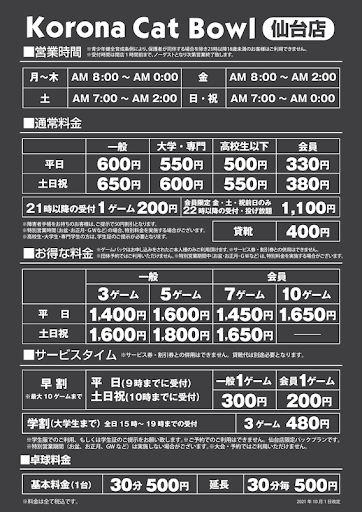 コロナキャットボウル仙台は 2020年9月30日までは、小学生から 高校生まで、3ゲームまでなら1ゲーム 100円なので 家族で行ってもお安...