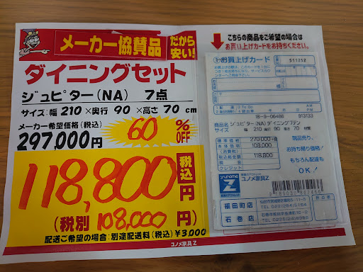 Read more訳あり商品を取り扱っているお店で50%OFFの半額は高すぎると思いました。 やはり、60%〜欲を言えば90%まで下げられる商品はあると思います。 それから、配送料が掛かるのもどうかと思いました。 責めて、県内ならば無料配送でお願いしたいと思います。(設置料込み) アマゾンやネット商品でも安くて配送料無料(中には設置も含む)なので、老舗の湯目家具様には出来ない事は無いと思います。(特に訳あり商品なのでね!) 但し、中にはええ商品(気に入った商品)もあるので、時々は購入しますが、色々な意味でご検討頂けたら幸いに思います。 あくまでも個人的な意見なので、この価格帯でも満足して購入してる方は是非足を運んで下さい。(自分もその一人ですがね😂) よろしく...