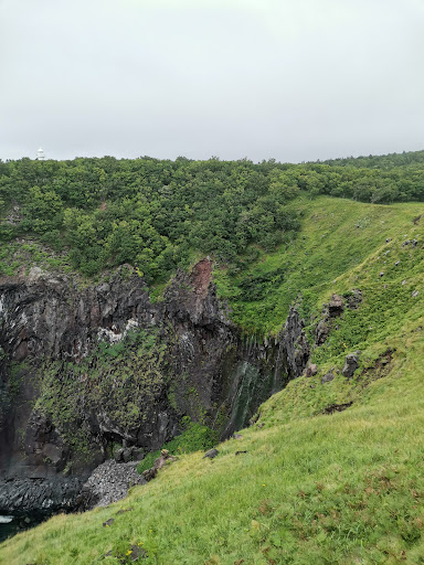 2022年9月上旬 気温30度 知床自然センターの横から出て、森の中を歩くこと8分、草原に出る。途中、道が分かれるが、どちらに行っても滝に着く。 草原の真ん中を通る道は幅1mぐらいで歩きやすい。草原の端を通る道は、地面が湾曲になっていて歩きづらく、もちろん並んで歩くことはできない。気温30度のカンカン照りの中、日陰もなく、汗だくで歩くこと10分で到着。 フレペの滝は、角度的に見えづらく、距離があるため、よく見えない。柵越しとはいえ、身を乗り出すのは崖から落ちそうで怖い。やはり滝は上から見るより下から見上げたい。 海と崖...