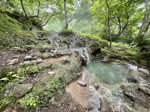 A wild onsen! Three pools of different temperatures. Poole is about 45°C, middle pool 42°C and bottom pool 39°C. wonderful to sit there in the forest and hear that stream gushing down the mountain. Forest bathing - both bathe while in the forest and also bathe by being among the forest trees.