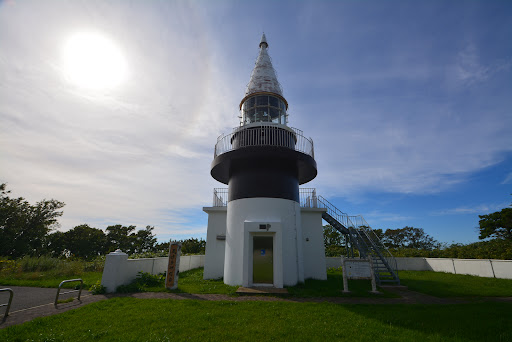 Read more2024年5月26日初訪問です。 道路から見えないので、意識してなかったのですが、白黒の「日本一の灯台」ということで、あえてこの灯台を目的にやって来ました。 何が日本一かと言うと、「海面から灯台塔頂の高さ」が日本一とのことでした。(昭和12年の初点灯時は、「海面から灯台の灯火の高さ」も「海面から灯台塔頂の高さ」も日本一だったらしいのですが、その後どこかに抜かれて、平成13年の改修の際に、屋根だけ高さを加えて、「海面から灯台塔頂の高さ」の方だけ巻き返したそうです。) 三角帽子の愛嬌のある灯台です。 灯火部分はのぞけませんが、2階部分までは階段で上がれます。灯台を眺めることが出きるベンチ付きの東屋もあります。車も横まで行けます。(デコボコですけど灯台まで簡易舗装されていて、砂利道ではありません。でも、車同士の対向は無理、急斜面です。加えて熊注意) 今日は曇りで天気が良くなかったけど、晴れていればキレイな...