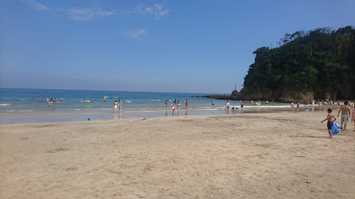 真っ白な砂に、コバルトブルーの海のコントラストが超綺麗です。 海岸沿いにソテツ並木があり、南国ムードが漂います。 本当にココが伊豆のビーチか?と見間違うほどです。 入田浜から国道136号の北側にある別荘地やコンドミニアムは欧米人が多く所有しており、浜の前には外人専用の宿泊施設もあるのでビーチの外人率が激しく高いです。 日によっては、海水浴客の半分が欧米人な時もあるくらいです。 客層は小さな子供連れの外人を始めとして、行儀良い海水浴客が多いです。 ラジカセをガンガンかけたり、大騒ぎしてたりする人は居ませんし、白浜大浜海水浴場のようなオラオラ系海水浴客や、変な客引きも居ません。 子供連れにはピッタリの海水浴場だと思います。 波もそこそこあるので、ボディーボードをやるのに適してます。 浜右奥の岩場を進むと舞磯浜や吉佐美大浜まで行けます。 ビーチ中央部に若干の岩場はありますが、シュノーケル目的の方には物足りないでしょう。