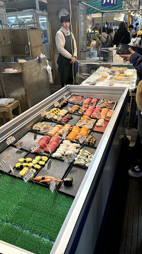 The fish market was bustling with activity and itโs the first time we see so many varieties of sushi being displayed. We opted for this brightly colored yellow shop that has a logo that says โ good touristโ. Friendly service and the sweet prawn and otoro were such large pieces and deliciously creamy.
