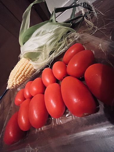 色々と店員の方々に聞いて沢山の陳列、種類のあるトウモロコシ、トマトの中から、この二品頂きました。