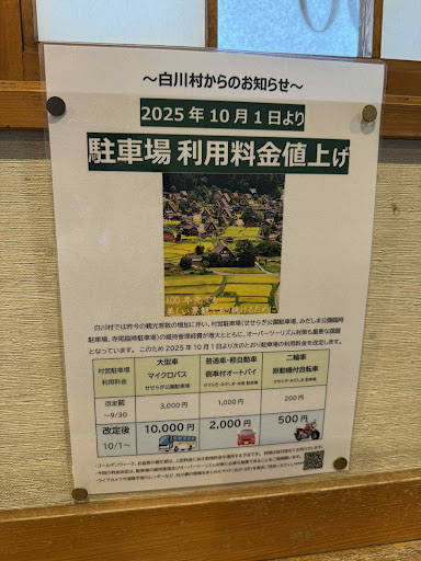 Expensive and closes extremely early. Why do they close the parking lot so early? Good question. Where does the money go? They don't use it for improving tourism or information about and around the village for international tourists. I can only assume that the local residents use tourism income to offset the costs and inconveniences of living in the remote countryside. More clarity would also help visitors to understand how their visit helps to contribute to Shirakawago's protection and maintenance. There are no benches or trash cans for tourists around the parking lot or anywhere around the village. A disagreeable fact given that the village is a UNESCO world heritage site with goals to educate, inform, promote culture, understanding, history, etc. More hospitality for tourists, from the beginning upon entering the park, should be taken into consideration and provided. At the very least, work on informing guests (in languages other than Japanese) about some of the things touched...