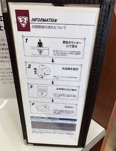 ①買取カウンターで受付 ②品物の査定 ③見積もりの確認 ④納得いけばお金を貰う