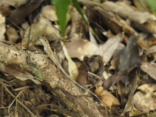 最初ただの川だと思って写真を撮ってきたのですが、後になってからこれがカンピレーの滝だと認識しました。一般的なイメージからは少し離れている滝です。 浦内川上流の船着場から徒歩で50分、全力疾走で15分くらいです。 「カンビレー」はこの地方の方言で「神々の座る場所」を意味し、ここは聖地だそうです。かつてここに西表島の15ヶ所の神が集まって、島づくりについて語り明かした場所なんだそうです。 水を補給しながら地面を見たら、尻尾の長いトカゲが居ました。 帰りの船の都合で文字通り駆け足で見学してしまいましたが、もっとゆっくりしていればいろいろな生き物が見れ...