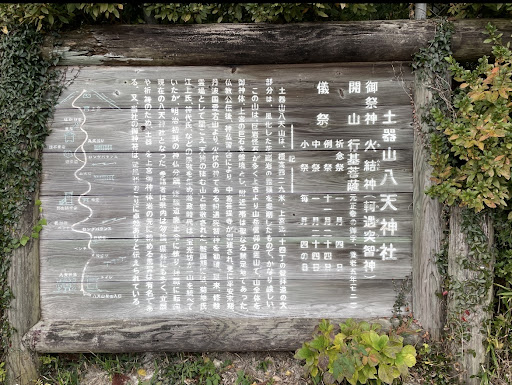 構造特徴・概要標高426mの神奈備形の山である土器山をご神体とする神社で、頂上直下に上宮、中腹に菩提寺が、山麓に下宮となる八天神社が鎮座する。祭神は、火の神迦具土神を祭神とする。開山は、養老五年行基菩薩と伝える。八天狗信仰の山として、修験道の道場として栄えている。上宮には、磐座である巨岩があり、二つの巨岩の間に多数の素焼きの小皿が見られる。上宮に複数の巨岩が存在し、その周辺では祭祀の跡を物語る土師器小皿が認められる。中宮となる菩提寺は、御神体となる巨岩に不空羂索観音と不動明が彫られ磨崖仏である。山中には、親不孝岩・胎内くぐり岩と呼ばれる巨岩が見られ、修験道の活動を知ることができる。