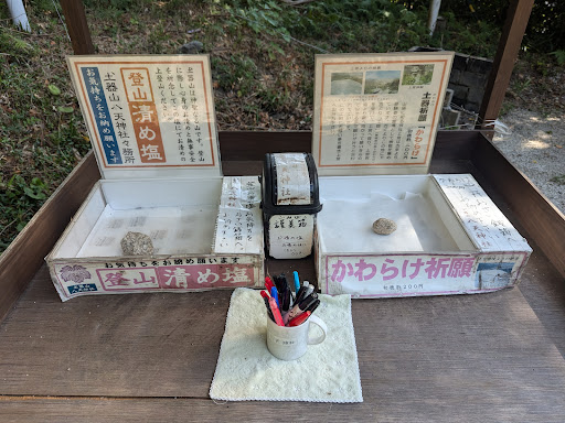 登山入口處旁有桌子放有鹽和小陶碟 , 可在碟子上寫上願望並帶上去