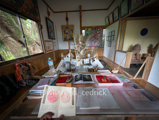 Got my Kumano Kodo stamp here. The shrine has some nice paintings and sculptures to see. You'll know you're close when the natural trail turns into concrete. From there, it's a short hike up a concrete slope before you head back onto the...