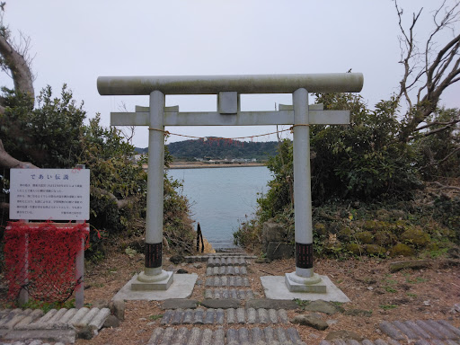 であい伝説 昔から春になるとイワシの群れが島を囲んで海を深紅に染めたことから、伝説によれば宇賀明神の白いヘビと深紅のイワシの出逢い生愛が幸せを呼ぶスポットとして今も語り継がれている。