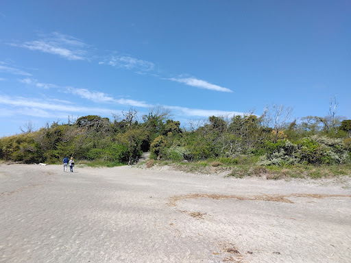 森と砂浜があり、夏場は海水浴場になります。 島へは砂州は歩いて渡るしかないため、手前の駐車場に車を停めて徒歩で砂浜を歩きます。 島内は小さいながら見所が多く、反対側まで出ると海と夕陽がキレイに見える岩場の海岸に出ます。 人が通れる洞窟もあり、これもなかなか面白い。