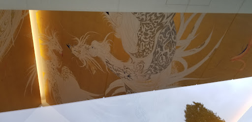 次に,社殿天井裏の鳳凰図は天野喜孝による。FF7のイメージイラストレーターでお馴染み。金の下地の上に雌雄二羽の白い鳳凰をハート型に描いているが,これは当社が縁結びの霊験を意識してとのこと。未来から来たという設定だそう。この「未来から飛来した鳳凰を描こう」という発想は,高句麗古墳壁画から来ているそうだ。 狛犬はニホンオオカミをモデルとしている。彫刻家土屋仁応による。 これらが伝統的な神社で見られる神使や守神に当たるのだろう。