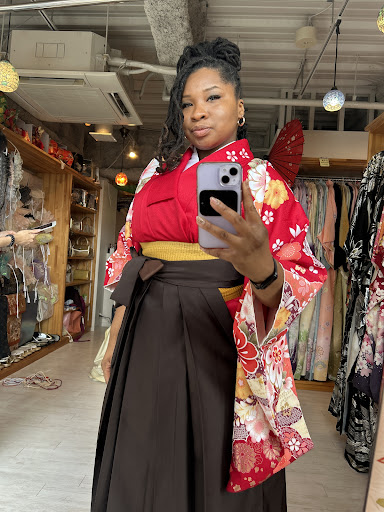 Upstairs, there was no designated area for putting on our scarves, forcing my mom and I to use a cramped corner of the shop. This lack of consideration was disappointing, especially for my first time wearing a kimono.