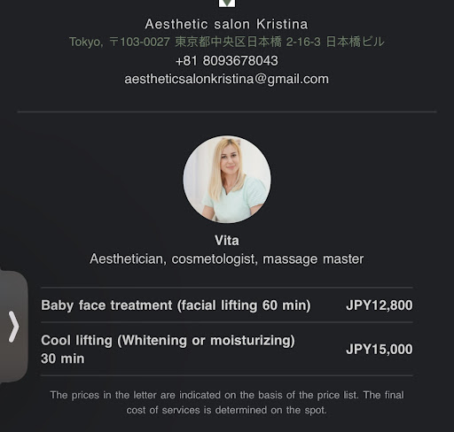 Read moreAesthetician was good and I liked the face massage she did. IPL was not painful at all and laser with quick too. She speaks English which was helpful to communicate. I think I didn’t pick up the right treatment as doing IPL only once wasn’t helpful. I waited couple of days to see if I find any difference in my texture or skin but no change. It would have been great if estheticians suggest alternatives for one time visiting customers to see the impact. Considering the amount you pay, I feel the duration of massage/ IPL is less for 50 min. But that was mentioned in advance in email, so I should have known it. For management, charging 10% extra on card payment is a huge amount and no where in Tokyo for other treatments at salons like hair spas, facials or nail treatments, they charge this hefty extra. Ekterina was nice to give me time to get the cash to avoid the extra charges but getting such amount cash at one time is not possible on International cards. Hope you can add more payment options like Suica or charge less and...