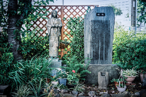 敗戦後のどん底期に寄る辺を失った者たちが廃品回収のバタヤとして、言問橋そばの河川敷に生活共同体『蟻の会』を結成し家族共々身を寄せ合うのだが、ポーランドから来たゼノ修道士が大学教授の娘、北原怜子を引き合わせたことで劇的な話に。『蟻の街のマリア』と語り継がれ、映画にもなったエリザベト怜子は『蟻の会』の子供たちに献身的にふるまい、結核により28年の短い生涯を閉じる。彼女の尽力により、立ち退きを強制されていた『蟻の会』は、ここ江東区深川8号埋立地の現『潮見教会』に移転することとなった。【われは主のつかいめなり、仰せの如くわれになれかし】と刻まれた像が敷地内に立つ。内発性に従い、理由なき利他に没入したプラグマティズムの極み。#photobybozzo