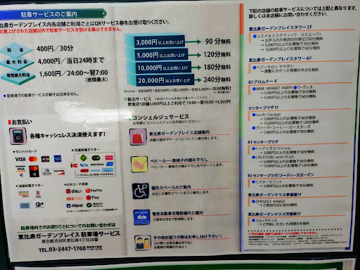 駐車場サービスはガーデンプレイスのルールに従うが、この店舗の場合は3.000円の買い物で90分無料から。(5,000円120分、10,000円180分、20,000円240分) 駐車場システムは1年ほど前に改善された。以前はガーデンプレイス内1店舗のみで上記金額の購入による駐車サービスだったが、現在はガーデンプレイス内各店舗のサービス時間合算が可能になった。(QRコードをもらうことによる精算) 案内写真を別途添付し...