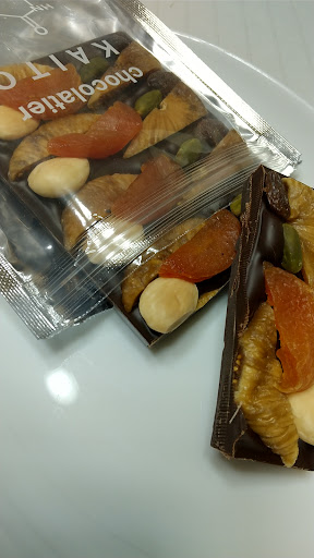 カカオ72%のチョコレートにイチジク▪レーズン▪アプリコット▪アーモンド▪ピスタチオ を乗せた板チョコでした。 家族の感想はまずカカオ72%とは思えないマロヤカでメジャーなメーカーの72%より 遥かに美味しいとのことでした。