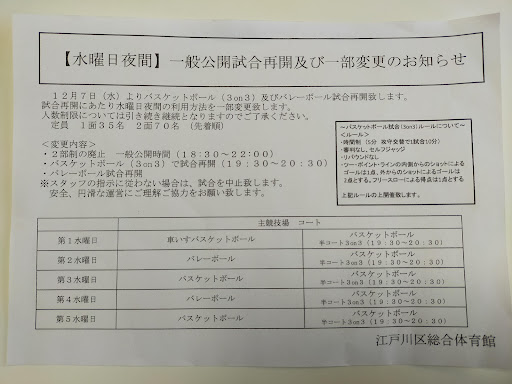 Read more2 full basketball courts in the stadium, opened to the public on Wednesday night at 210yen. There is a 3 on 3 pickup game on one of the courts. Quite a lot of people sometimes, but it is a reasonable price to do...