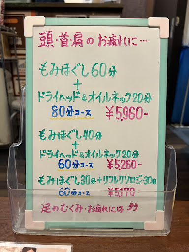 Read moreOur guide from Tours by Locals, Chie, recommended this massage place as it was close to our hotel. Great shiatsu massage by Okamoto. I fell asleep soon after she started. You have various options like 30, 60, 75, 90, 120 minute sessions and they have mostly male therapists but we were able to request for female therapists. All were Japanese and Okamoto spoke good English. The base rate for 60 mins is 3980 yen and there’s a 300 yen supplement for a female therapist. We also paid 100 yen for clothing to change into, which was a long sleeved shirt and track pants (this is optional). The rooms are divided by curtains but since you’re not naked that’s fine. I think this place is good...