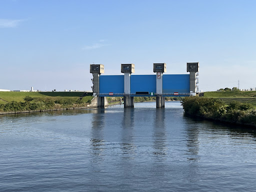 Read more隅田川下流域を洪水から守るために荒川との分岐部の隅田川入口に設置された水門です。 隅田川流域は人口密集地域であるものの堤防が低いため洪水リスクが高い場所になります。そのリスクを下げるため、大雨による水位上昇時には水門を閉めて堤防が高い荒川側に水を流すようになっています。通常時は水門は開いていて、荒川に7割、隅田川に3割の水が流れるようになっています。