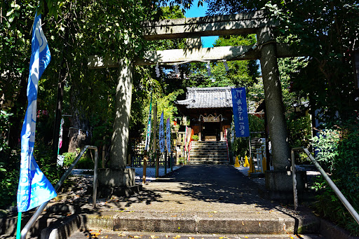 This shrine is popularly referred to as Karasumori Inari Jinja, reflecting the pre-modern name of its location. As with many other Inari Jinja the date when this one was founded is unclear, but there are two accounts of how it came into being. The first is that during the Genryoku Period (1688-1704) a man called Shinzaemon Shinbori (新堀新左衛門) of what was then Shimoumabikizawa Village下(馬引沢村) moved a small shrine where Inari Kami was worshipped from the grounds of a temple called Jufukuji (寿福寺), now located at Kamimeguro 5-16-6, to the shrine’s current location. The second account is a little more colourful. Without giving any date, it tells us that the Shukuyama Inari support group (Shukuyama was the name of part of Kamimeguro in pre-modern times) was returning from a visit to the Karasumori Jinja in Shimbashi when a white fox either became a horse or a white fox riding a horse appeared to them. Either way a shrine was built to commemorate the event. Until Meiji times the shrine was regarded as housing the guardian deity of what was then Kamimeguro Village. In 1889 a new municipal system was established. The name of part of Kamimeguro in Meguro Village was officially recognised as Karasumori and the shrine became Karasumori Inari Jinja. Following a revision of the municipal system in 1922 however, the area’s name was changed to Kamimeguro San-chome, the name Karasumori dropped both from the municipality and the shrine. Even so a kindergarten and primary school and other facilities still include Karasumori in their names. Reflecting its relatively well-wooded nature the shrine has been designated a "preserved forest" (保存樹林) by Meguro-ku. The forest is 889 sq.m. in area and consists mostly of Gingko, Zelkova, and Bamboo...