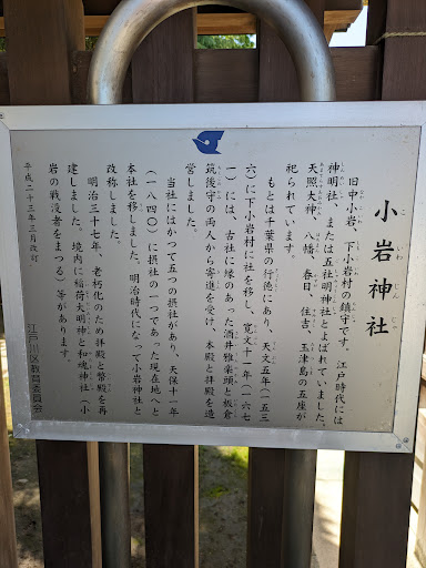 Read more小岩神社は江戸川区小岩、JR小岩駅から徒歩10分程の場所に鎮座しています。 創建は不明ながら、古社であったと言われています。元は東葛西領行徳に鎮座し、天照皇大御神・住吉大神・天児屋根大神・八幡大神・衣通姫大神の五柱の神を祀り「五社明神」と称していのが、天文五年(1536)小岩地区に遷座して寛文十一年(1671)に幕閣の酒井雅楽頭らに社殿の寄進を受けました。天保十一年(1840)村落の中央に位する現在の地に再び遷座しました。それまで「五社明神社」と称せられていたものが、明治初年に「小岩神社」と改称しました。 ご祭神は、天照大御神(あまてらすおおみかみ)、表筒男命(うわつつのおのみこと)、中筒男命(なかつつのおのみこと)、底筒男命(そこつつのおのみこと)、天児屋根命(あめのこやねのみこと)、誉田別命(ほんだわけのみこと)、衣通媛命(そとおりひめのみこと)の七柱です。(住吉大神を三柱に分けて現しています)。 境内には昭和五十四年(1979)に氏子崇敬者によって建立された神門もあります。社殿は関東大震災や第二次大戦の戦火を免れたものの、老朽化したものを昭和三十七年(1962)に再建し、現在に至ります。 拝殿の左手には「わらじ石」と呼ばれる石が置かれています。わらじ石を撫でながら祈願すると、足の怪我や病気などが治るとされています。 境内の左手には小さな富士塚が整備され浅間神社が鎮座しています。また、わらじ石の左手には三峯神社があります。 左手には道案内の神・猿田彦命を祀る道祖神社があります。日枝神社の石祠もあります。 その他境内社としては、千本鳥居の奥に稲荷神社があります。水神社もあります。 広くはない境内ながら、よく整備されて、様々な信仰が凝縮された空間となっています。 御朱印は社務所にていただけます...