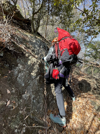 岩壁ロープワーク練習 3班に分かれて10m?位の岩壁をロープを使って登り下りする練習、ロープがあると最悪落ちても大丈夫というのはやはりかなり安心。私はちゃんと3点支持が出来ていなく安全確保する前に登ってしまう傾向がある様で指摘してもらったので改めて岩稜帯での移動の仕方を見直したいと思った。