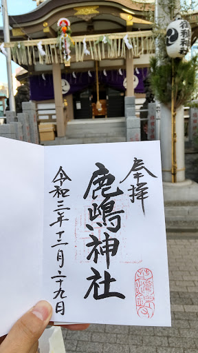 次に鹿嶋神社の御由緒。 御祭神は武甕槌命。 その昔、沖の方より神殿がこの地に漂着した。 中には幣帛があったが打ち寄せる波に少しも濡れておらず、どこの社のものか不明なまま海岸に安置された。 後日、常陸国の人が探しに来て、鹿島神宮に鎮座していた一社であると判明し持ち帰った。 が、再び同じように流されてしまい、またしても全く同じ場所に流れ着いてしまう。 さらに「この浦に祀り坐すべし」と御神託があり、当地の人々はこの奇瑞に驚き、宮所を定め祀ったのが始まりとされる。